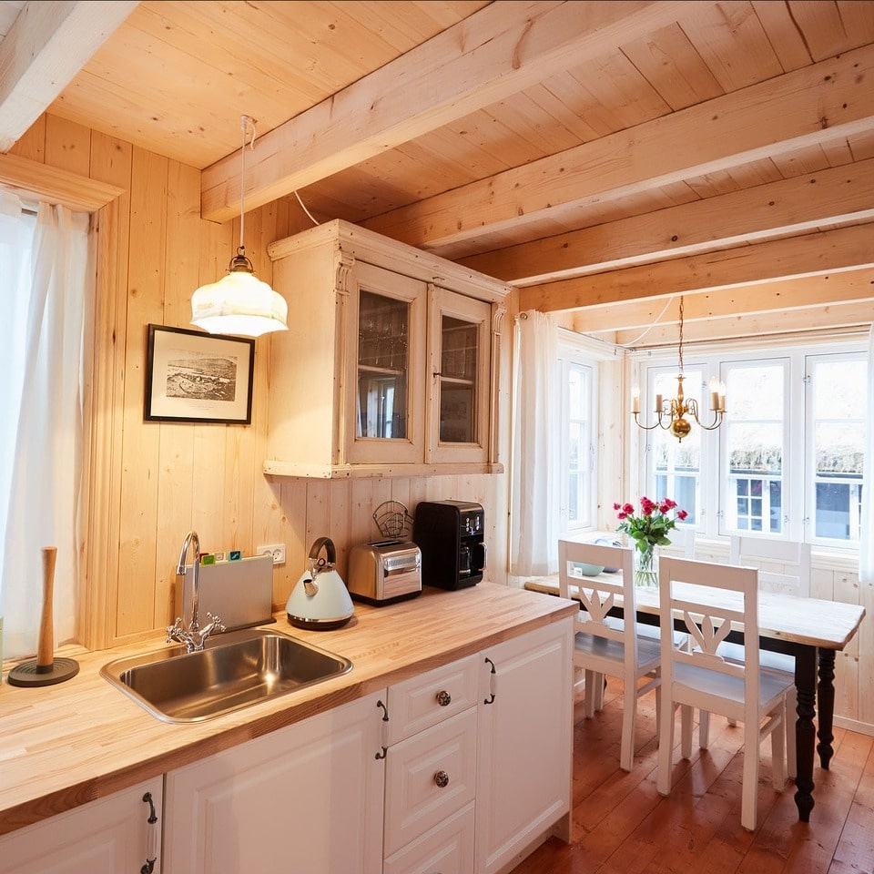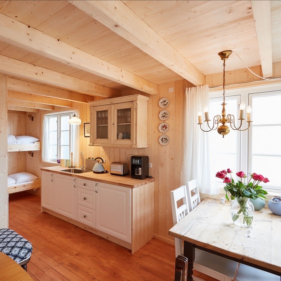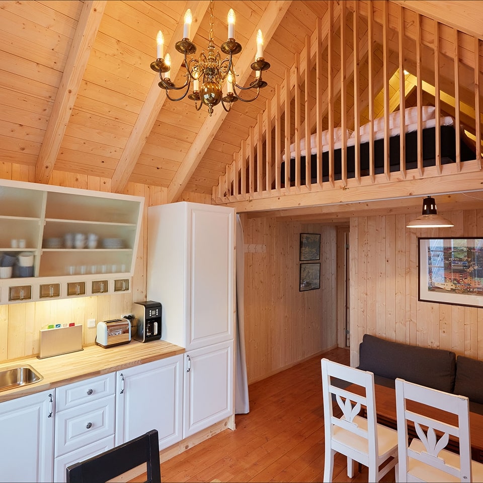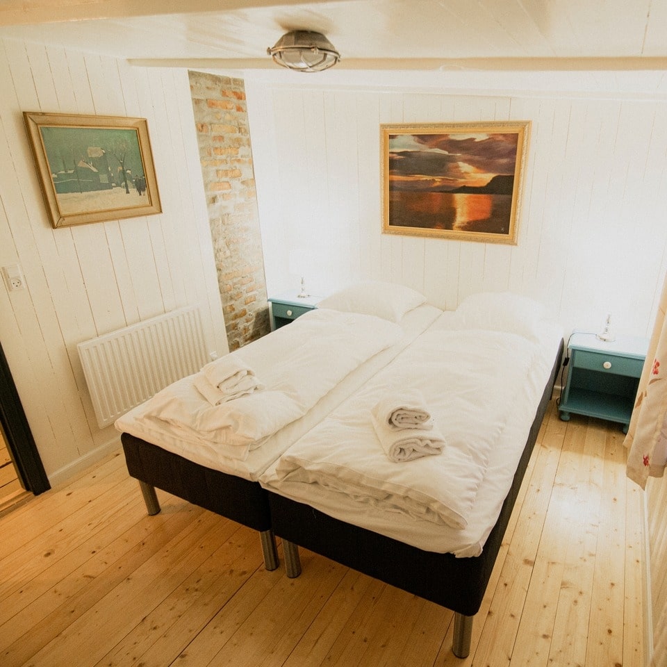 Niðasta hædd: Baðirúm, tekøkur, tveymanskamar við tveymanssovisofu.