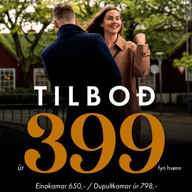 Tilboðið er galdandi, tá bílagt verður til 2 fólk í dupultkamari. Prísur fyri einakamar 650,- og dupultkamar 798,-.